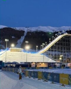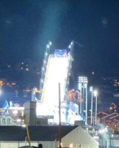 夜になると、フリースタイル競技のコースがライトアップされ幻想的な景色に。ナイトゲームならではの迫力ある演出で、会場の盛り上がりも最高潮でした!